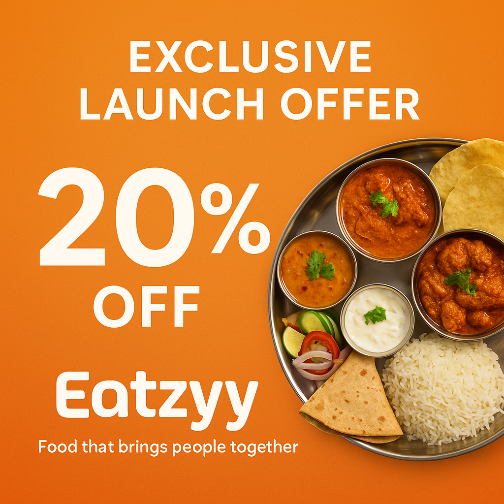 Eatzyy 🍴 | Cloud Kitchen 📍 Taste that travels to you 🍛 Veg & Non-Veg Thalis | 🍔 Fast Food | 🥗 Healthy Bites 🚀 Fresh • Hygienic • Delivered Fast 💥 Exclusive Launch Offer: Flat 20% OFF! 👉 Order Now & Experience the Zaika!